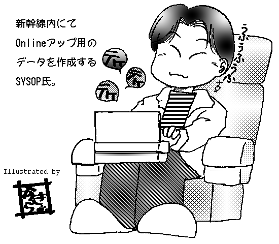 esq-OnlineというBBSのSYSOPである三谷氏は、当時新幹線で移動中に、 BBSへアップするためのデータを作成していた、という話から描いたものだと思う..... ファンの人からは「こんなんじゃありません!!」とお叱りを受けそうだけどね(爆)